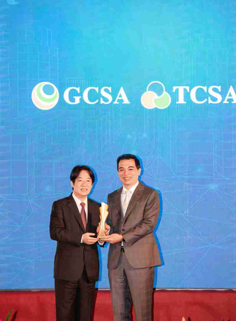 达全方位永续表现获全球永续奖及台湾永续奖肯定,,由副总统赖清德颁奖 (左),,,尊龙z6总经理柯富仁 (右) 代表领奖
