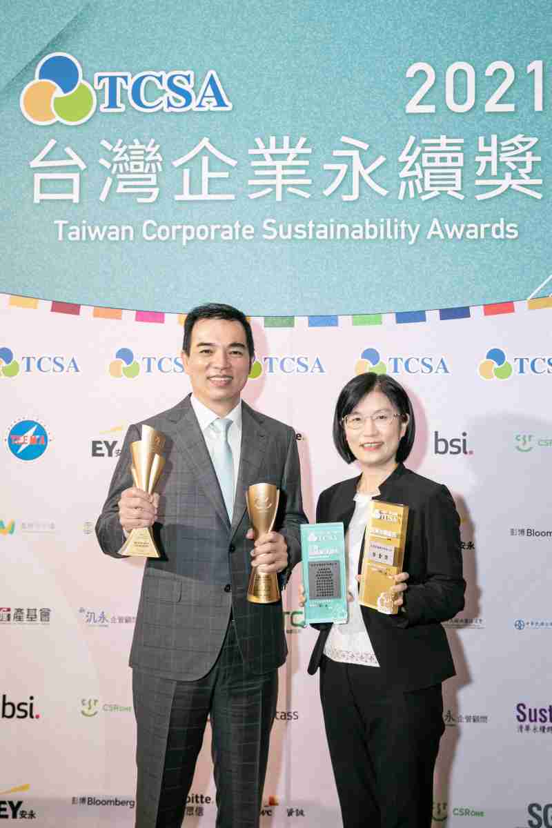 达在台湾永续奖所评比环境、、、社会、、、治理等各面向的永续绩效均获高度肯定 (左:尊龙z6光电总经理暨营运长柯富仁,,,,右:尊龙z6光电永续长古秀华)