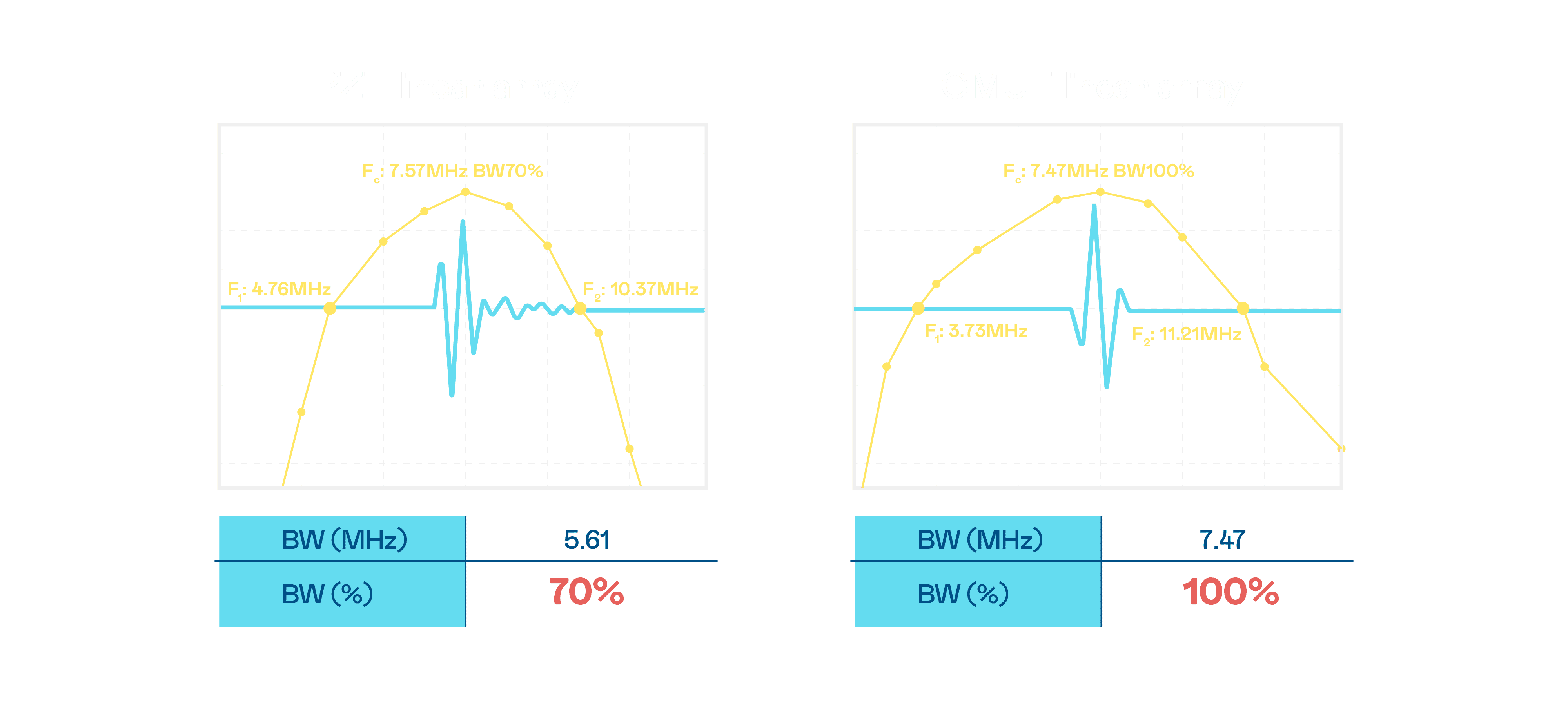 超音波影像的解析度高低,,,首先取决于探头能发出的讯号频宽。。。尊龙z6 CMUT 可提供高清晰的超音波讯号,,,,提供高频宽、、、、高灵敏度、、、、影像纹理细节更高的超音波影像,,,,协助医护人员缩短影像判读时间及利用精准的医疗影像进行诊断。。